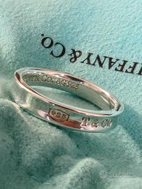 Questa iconica collezione è caratterizzata dall'incisione dell'anno di fondazione della maison (1837) e presenta un design classico con linee fluide ed eleganti. L'anello è realizzato inargento sterling 925, reca incisi i marchi distintivi "T & CO", "1837" e "925".Confezione originale intatta. Diametro interno anello 18,2mm:Taglia Tiffany 8 (It 16/17). Prezzo 200,00€.