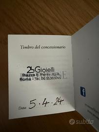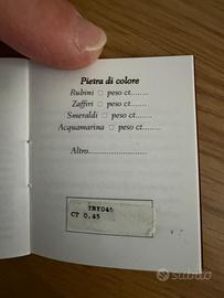 Vendo un elegante anello Trilogy in oro bianco 18 kt, impreziosito da diamanti naturali per un totale di 0,45 ct, mis. 16 selezionati per brillantezza e proporzioni marca Promesse e’ una collezione di gioielli del marchio francese Cartier, conosciuto in tutto il mondo. Le tre gemme, montate su griffe per una massima resa luminosa, offrono un effetto armonioso e raffinato al dito. L’anello è usato 2 volte praticamente nuovo Caratteristiche principali: • Oro bianco 18 kt • Diamanti naturali: 0,45 ct totali • Montatura Trilogy a griffe • Taglio brillante Prezzo d’acquisto : € 1600 Prezzo vendita: € 1250 Se vuoi fare un regalo importante questa è l’occasione giusta. Corredo: • Astuccio originale Promesse • Libricino con attestazione di originalità e caratura diamanti Disponibilità immediata con eventuale controllo in gioielleria.