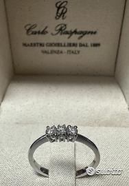 ANELLO TRILOGY IN ORO BIANCO 750°/°° - 18 carati CON DIAMANTI* NATURALI TAGLIO BRILLANTE PESO ORO ANELLO gr. : 2,00 DIAMANTI ct. : 0,23 - Colore : G / Purezza:VS MISURA DEL DITO: 14 (DISPONIBILI ANELLI TRILOGY DI VARIE CARATURE A RICHIESTA)