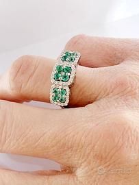 Anello da Donna modello trilogy magic grande con Diamanti bianchi naturali taglio brillante ct 0,55 e Smeraldi ct 0,57 centrali lavorato in Oro Bianco 18kt-750- Grammi 4,60