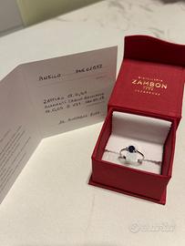 Anello Trilogy zaffiro blu 0,41 ct al centro con due diamanti taglio brillante tot 0,5 ct Materiale oro bianco 18 kt Scatola originale e certificato