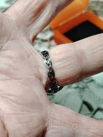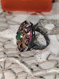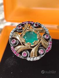 Spettacolare anello in argento 925, non punzonato ma testato, e bronzo, con radici di rubino, zirconi bianchi ed al centro, una stupenda radice di smeraldo