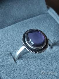 Design classico e senza tempo, impreziosito da una pietra ovale viola a taglio cabochon, liscia e luminosa, incastonata in una montatura lavorata con bordo decorativo in stile vintage.