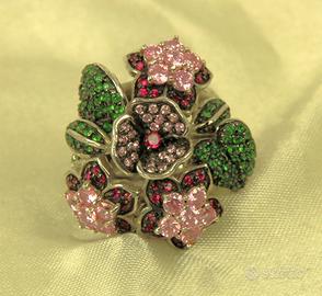 Spettacolare grande anello "vintage " in argento massiccio 925, composto da insieme di fiori e foglie con pavè di pietre colorate.