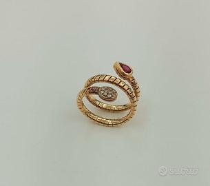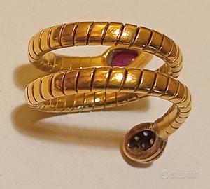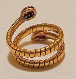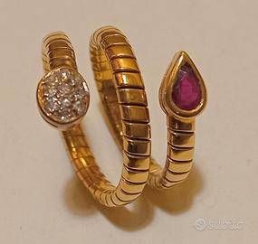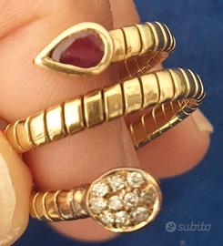 Anello vintage originale tubogas serpente stile Bulgari 8,78 g in oro 18Kt con rubino a goccia di notevole trasparenza e 10 brillanti.