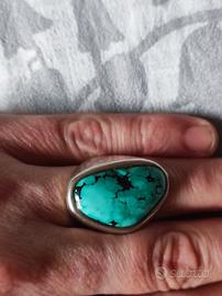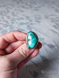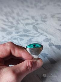 Anello vintage artigianale in argento 925 punzonato, caratterizzato da una splendida turchese naturale dalla forma irregolare, con la tipica matrice nera che mette in risalto il colore verde–azzurro intenso. Il castone è in stile classico e massiccio, con montatura a castone pieno che incornicia la pietra in modo pulito ed elegante.