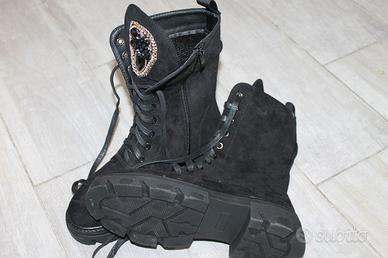Stivaletto nero in pelle scamosciata, stringato con zip. Decorazione a coccarda in cristalli e paillettes.