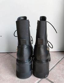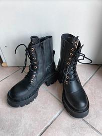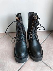 Anfibi donna neri in vera pelle, con tacco in gomma. Apertura con comoda cerniera e lacci per regolare la larghezza. Nuovi, indossati due volte senza segni di usura. Fanno parte della collezione A/I 24/25. Sono molto comodi e caldi, impermeabili.