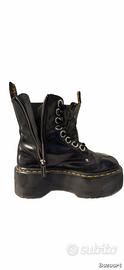 Vendo anfibi Dr. Martens neri con suola platform alta, modello iconico con 8 fori, zip laterale e classica cucitura gialla.