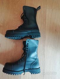 Anfibi nr.40 unisex, 10 buchi neri in pelle con punta in metallo (modello '80-'90 senza cerniera laterale, solo lacci). Usati pochissime volte, vendo per inutilizzo. Marca ModaMilitare