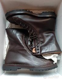 Foto principale: anfibi militari originali Esercito Italiano, suola antiscivolo vibram, rinforzo con gomma anteriormente, protezione malleolo, 100% impermeabile, numero 47 (calza 46 pieno), nuovi in scatola originale. Per confrontarli con la vostra calzata, dal tacco alla punta misurano 33 cm