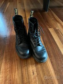 Classici Dr. Martens 1460, modello iconico caratterizzato da 8 occhielli, la linguetta posteriore con logo "AirWair" e le inconfondibili cuciture gialle sul guardolo.Questi anfibi sono realizzati in pelle Smooth, una pelle liscia, resistente e rigida all'inizio, che tende a diventare più confortevole con l'uso. La suola è dotata di cuscinetto d'aria (AirWair), che garantisce ammortizzazione e resistenza ad oli e grassi.