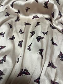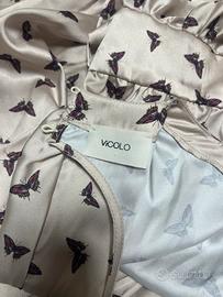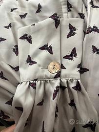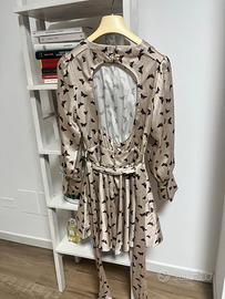 Elegante abito Vicolo con una delicata fantasia di farfalle. - Tessuto satinato color beige con stampa nera. - Maniche lunghe con dettaglio - Fascia in vita. - Gonna svasata con dettagli. - Lunghezza al ginocchio.