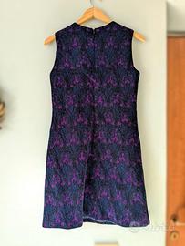 Favoloso tubino firmato dalla stilista Anna Sui, realizzato negli Stati Uniti / Made in U.S.A. Il capo si presenta con una particolare fantasia tra il floreale e il barocco, dal colore blu e blu scuro su sfondo viola. Tessuto tipo lana cotta. Senza maniche, con scollo tondo e chiusura lampo posteriore. All'altezza del petto è presente una particolare lavorazione a rientranza del tessuto a croce.