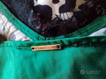 Stampa fantasia davanti e tinta unita verde smeraldo dietro.
