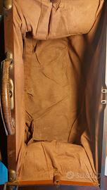Antica borsa da viaggio in pelle con chiusura centrale in metallo, epoca primi '900 completa di alcuni adesivi d'epoca di località turistiche