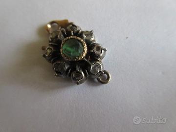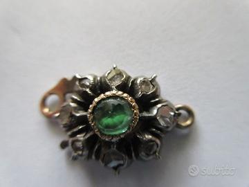 Antica chiusura per collana. Montatura base in oro 14 kt. Sopra forma a fiore in argento con incastonati 8 piccoli diamanti e al centro un piccolo smeraldo.