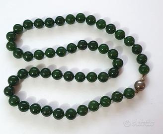 Bellissima collana antica di perle in vetro pregiate da 10 mm, colore verde.