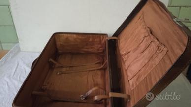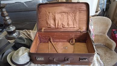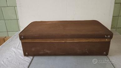 Antica valigia anni 30 in tessuto e cuoio. La struttura è solida e ben conservata. Ha ancora le 2 chiavette per le serrature che funzionano perfettamente. Misure 65x38x16. Se interessati, solo ritiro a mano a Torino.
