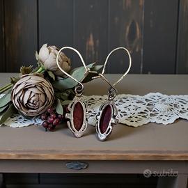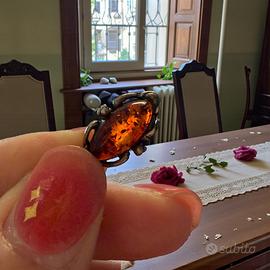argento 925 punzonato (anche testato) • pietre: ambra (cabochon a navette) • tipologia: orecchini pendenti con monachella • colore pietra: cognac/miele • montatura: lavorata con retro aperto • condizioni: buone, con patina/ossidazione coerente con l’età e l’uso • periodo: vintage