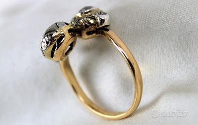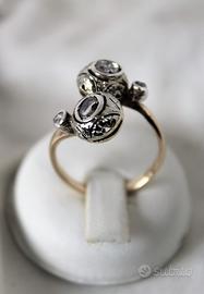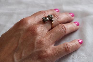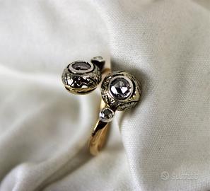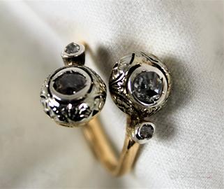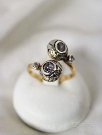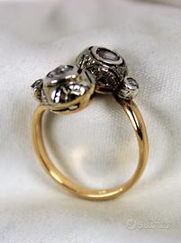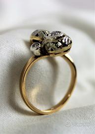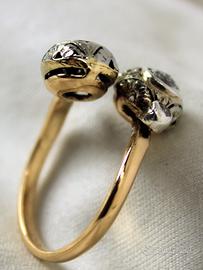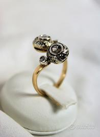 Antico anello in oro giallo e diamanti con 2 testate rotonde a " Contrarié ". Lavorazione a cestello globulare con castoni in oro ricoperti di argento, lavorati a mano con motivi floreali, in perfetto stile " Liberty ".