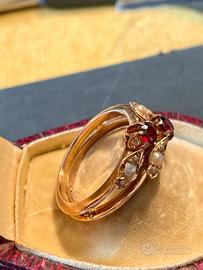 Antichissimo anello in oro 18 kt provato con gli acidi perché in quel periodo non cerano i marchi solo efffigi o umani o animali o stemmi .epoca1840/50circa con mezze perline e due granati naturali .misura dito 15/16 scatola non compresa