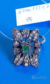 Antico Anello oro argento con diamanti rose e smeraldo naturale.