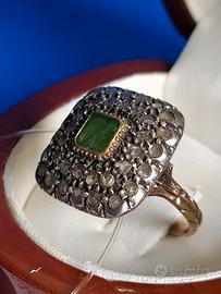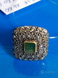Antico Anello oro argento con diamanti e smeraldo naturale.