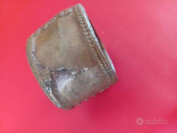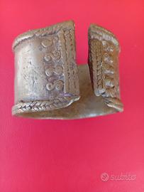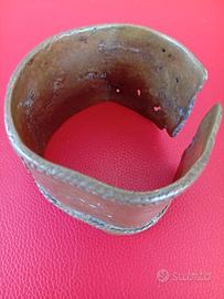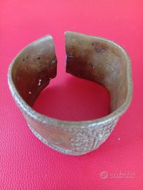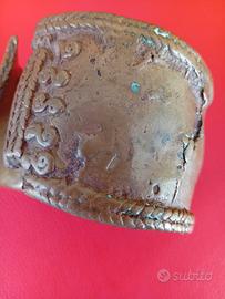 Buongiorno, vendo antico bracciale africano, presumibilmente ottone o bronzo con una patina del tempo. Presenta decorazioni artigianali antiche etniche, mostra chiari segni d'usura e di corrosione dovuti all'età, (vedi foto), e credo sia proprio questa la prova del suo vissuto, da collezione. Grazie per l'attenzione.