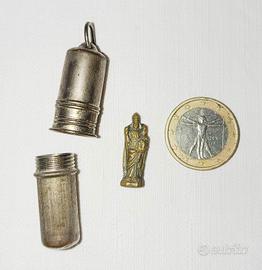 Questo oggetto è un anticosantuario tascabile religiosoin metallo argentato, probabilmente di origine francese. Il set include un astuccio cilindrico ("porta reliquie") con anello per appenderlo e una piccola statuetta metallica raffigurante la Madonna con Gesù bambino Questi oggetti erano utilizzati dai fedeli per portare con sé una reliquia o un'immagine sacra. Soprattutto dai soldati in battaglia. È un oggetto da collezione di devozione popolare. ..il suo peso è di 9 grammi