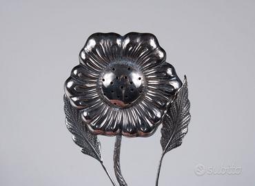 Antico spargitalco in argento 800 finemente lavorato a forma di fiore, autentico esempio di argenteria artigianale italiana databile al periodo anni ’50, realizzato dal marchio Brandimarte.
