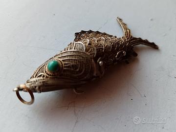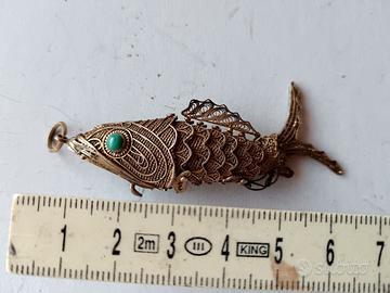 Antico pendaglio con tipica carpa snodata giapponese, di manifattura dei primi del 1900, in metallo dorato e occhio in pietra dura azzurra. In Giappone, un gioiello a forma di pesce (spesso raffigurante lacarpa koio ilpesce rosso) è un potente amuleto che simboleggiacoraggio, prosperità e trasformazione. La Carpa Koi: Forza e Perseveranza È il pesce più iconico del Giappone, spesso chiamato "gioiello vivente". Rappresenta la capacità di superare le avversità. Secondo la leggenda, una carpa che risale una cascata si trasforma in drago; per questo è simbolo disuccesso e ambizione. Indossare un ciondolo con carpa koi è un augurio di forza interiore e determinazione nel raggiungere i propri obiettivi.