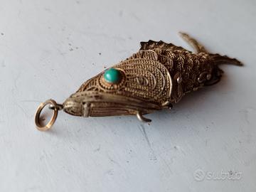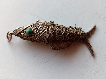 Antico pendaglio con tipica carpa snodata giapponese, di manifattura dei primi del 1900, in metallo dorato e occhio in pietra dura azzurra. In Giappone, un gioiello a forma di pesce (spesso raffigurante la carpa koi o il pesce rosso) è un potente amuleto che simboleggia coraggio, prosperità e trasformazione. La Carpa Koi: Forza e Perseveranza È il pesce più iconico del Giappone, spesso chiamato "gioiello vivente". Rappresenta la capacità di superare le avversità. Secondo la leggenda, una carpa che risale una cascata si trasforma in drago; per questo è simbolo di successo e ambizione. Indossare un ciondolo con carpa koi è un augurio di forza interiore e determinazione nel raggiungere i propri obiettivi.