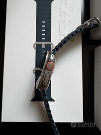 cassa in titanio da 49mm, il display Retina più luminoso di Apple (fino a 3000 nit), chip S9, GPS a doppia frequenza, batteria di lunga durata (fino a 36 ore), resistenza a immersioni (fino a 40m) e temperature estreme, tasto Azione personalizzabile e funzionalità avanzate per fitness, salute (ECG, SpO2, temperatura) e navigazione offline, ideale per escursionismo, nuoto e triathlon, con watchOS 10 e connettività cellulare opzionale