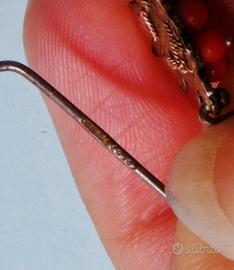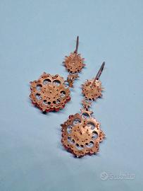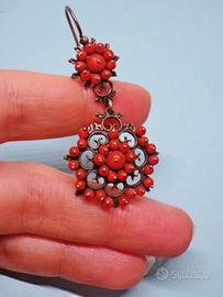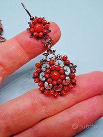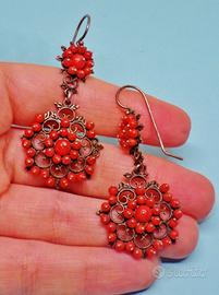 Orecchini pendenti vintage in filigrana sarda in argento brunito, dalla forma a rosone e costellati di perline di corallo rosso. Ciascuna perla è stata fissata a regola d’arte con un’antica tecnica artigianale (non semplicemente incollata!), nonostante ciò alcune si sono perse, ma questi orecchini restano assolutamente splendidi. Stile barocco / borbonico. Punzone 925 su uno dei due ganci (necessaria lente o buoni occhiali!) Lunghezza 5,4cm NO FOTO PORTATO NON VENDO A PESO NO CONSEGNA A MANO, SOLO SPEDIZIONE
