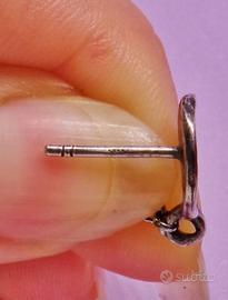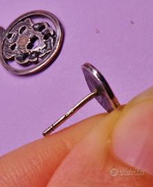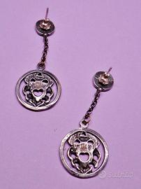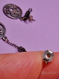 Orecchini lunghi in argento con motivo di monete greche (statere di Kroton) e maschere apotropaiche portafortuna. Lo stile è quello dei gioielli di Gerardo Sacco, noto per le sue creazioni ispirate alla cultura della Magna Grecia, ma non sono firmati e quindi provengono probabilmente da marchi simili come GoldArt / Tesoro di Hera / Michele Affidato. Punzone 925 sul perno (molto piccolo e difficile da vedere) e sulla farfallina. Lunghezza 5cm