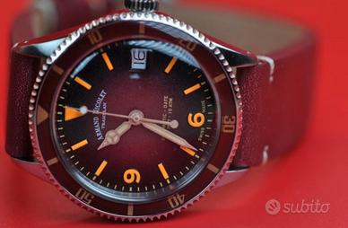 Elegante e raffinato orologio Armand Nicolet VS1, realizzato in Svizzera con grande cura artigianale. Cassa in acciaio inox lucido, quadrante rosso rubino fumé.. con finitura sunburst e indici applicati. Movimento automatico Swiss Made A500