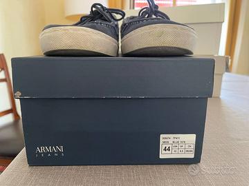 scarpe da uomo Armani Jeans modello casual in tela blu navy, ideali per la primavera/estate. Stile mocassino / barca con cuciture a vista e laccio decorativo. Suola in gomma bianca con logo “AJ” sulla pianta. Comode e leggere, perfette per un look casual o estivo.