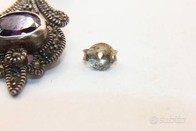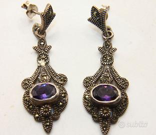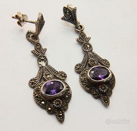 Questi incantevoli orecchini pendenti in stile Art Déco sono realizzati in argento finemente lavorato e si distinguono per una silhouette allungata di grande eleganza. La struttura è interamente decorata con luminose pietre di marcasite incastonate che creano un delicato scintillio metallico su tutta la superficie traforata. Al centro del pendente risplende un'ametista dal taglio ovale e dal colore viola intenso che conferisce un tocco di nobile contrasto alla montatura argentata. Con una misura di 46 x 14 mm, questi gioielli catturano l'attenzione per la ricchezza dei dettagli e per la tipica manifattura d'epoca che unisce geometrie classiche e decorazioni floreali stilizzate.