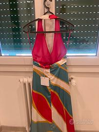 Artigli abito elegante da sera in raso misto seta con pietre Swarovski. Colori reali fucsia azzurro oro e bianco. Taglia 42 con etichetta mai indossato.