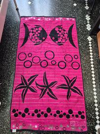Asciugamano da mare con un allegro design mai usato. - Fantasia con pesci stilizzati e stelle marine. - Dettagli a pois e cerchi. - Misure: 86x154