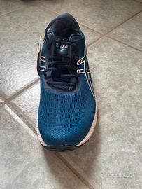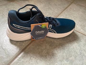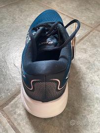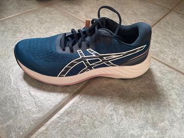 Vendo scarpe da donna Asics modello gel excite 9. L'articolo è completamente nuovo e mai usato. La scarpa è di colore blu, nero e rosa nella parte bassa della suola. L'articolo è inoltre completo di scatola originale che sarà spedita insieme alla scarpa.