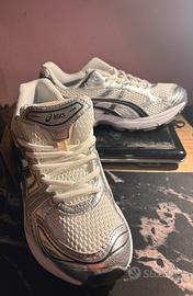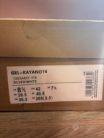 ASICS GEL-KAYANO 14 colorazione Silver/White, taglia 42 EU. Condizioni nuove, mai indossate, complete di scatola e cartellini. Modello molto richiesto, perfetto per uso quotidiano e outfit streetwear.