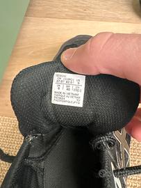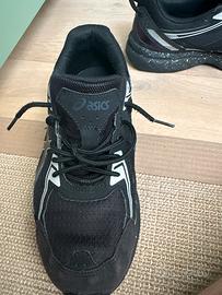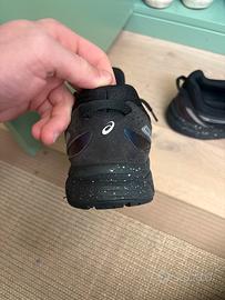 Modello: sneaker ASICS in stile running/lifestyle. • Colore dominante: nero. • Materiali: combinazione di mesh traspirante e inserti in suede (o simil-suede) per dare struttura. • Dettagli laterali: linee riflettenti bianche/argento che seguono il classico pattern ASICS. • Linguetta: nera, con logo ASICS bianco ben visibile. • Suola: intersuola con pattern puntinato (speckled), tipico di alcune serie come Gel-Lyte o Gel-Saga. • Stile generale: sportivo ma pulito, molto versatile per outfit casual.
