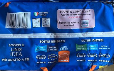 N. 6 confezioni da 14 Lines Idea Notte con ali, assorbenti lunghezza cm 31,7 ideali per flussi abbondanti, ripiegati in singole bustine, confezioni intonse, mai aperte.