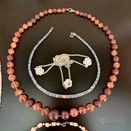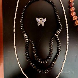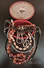Collana in spinello nero, collana di perle di fiume, farfallina in filigrana, collana in quarzo fragola, collana di corallo rosa, pendenti, il tutto in bella scatola di velluto rosso con coperchio placcato in argento