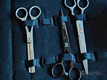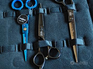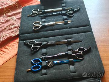 bellissimo astuccio in pelle, marchio ( creatore di forbici) Con al suo interno forbici nuove ( mai usate) tra le quali una Jaguar e una creatore di forbici, che sono sinonimo di grande qualità, tra di esse anche una forbice dentata per sfoltire i capelli. ogni forbice ha un costo minimo di 100 euro, nuove mai usate, le foto lo testimoniano, sono li fa vedere...
