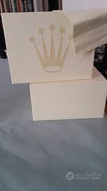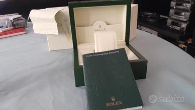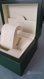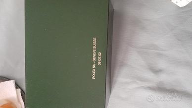 Vendo astuccio originale Rolex Daytona in pelle verde, praticamente nuovo, perfetto con libretto illustrativo orologio e scatola esterna in cartone color panna, compreso anche il panno pulisci vetro. Interno in pelle scamosciata beige chiaro con portaorologio. Misure 15 x 8 x 12