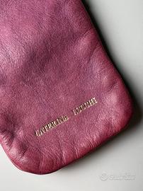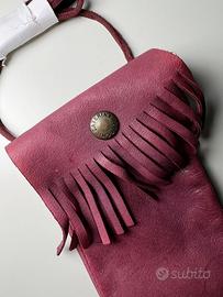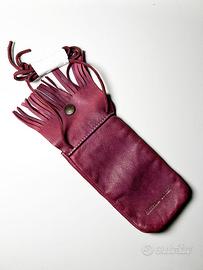 Simpatico astuccio in pelle color vinaccia, porta cellulare o documenti, con tracolla e tasca frangiata, originale CATERINA LUCCHI. Nuovo, mai usato. Consegna a mano a Grado, Trieste e in provincia di Gorizia.