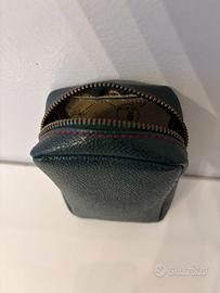 Astuccio porta sigarette Trussardi anni ’80. In materiale resistente, tipicamente utilizzato dalla maison Trussardi per produrre la pelletteria, in questo caso di un bel verde scuro con logo centrale rosso e pendaglio per aprire/chiudere la zip con logo. Misure: cm. 7 x 10 – spessore cm. 2,5